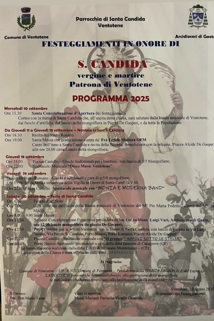 Eventi Festeggiamenti in onore di Santa Candida V.M.(locandina) Pubblicato 10/09/2025 Lascia questo campo vuotoRIMANIAMO IN CONTATTO! Ci piacerebbe aggiornarti con le nostre ultime novità Non inviamo spam! Leggi la nostra Informativa sulla privacy per avere maggiori informazioni.Privacycheck * Accetto le regole sulla privacy Controlla la tua casella di posta o la cartella spam per confermare la tua iscrizione